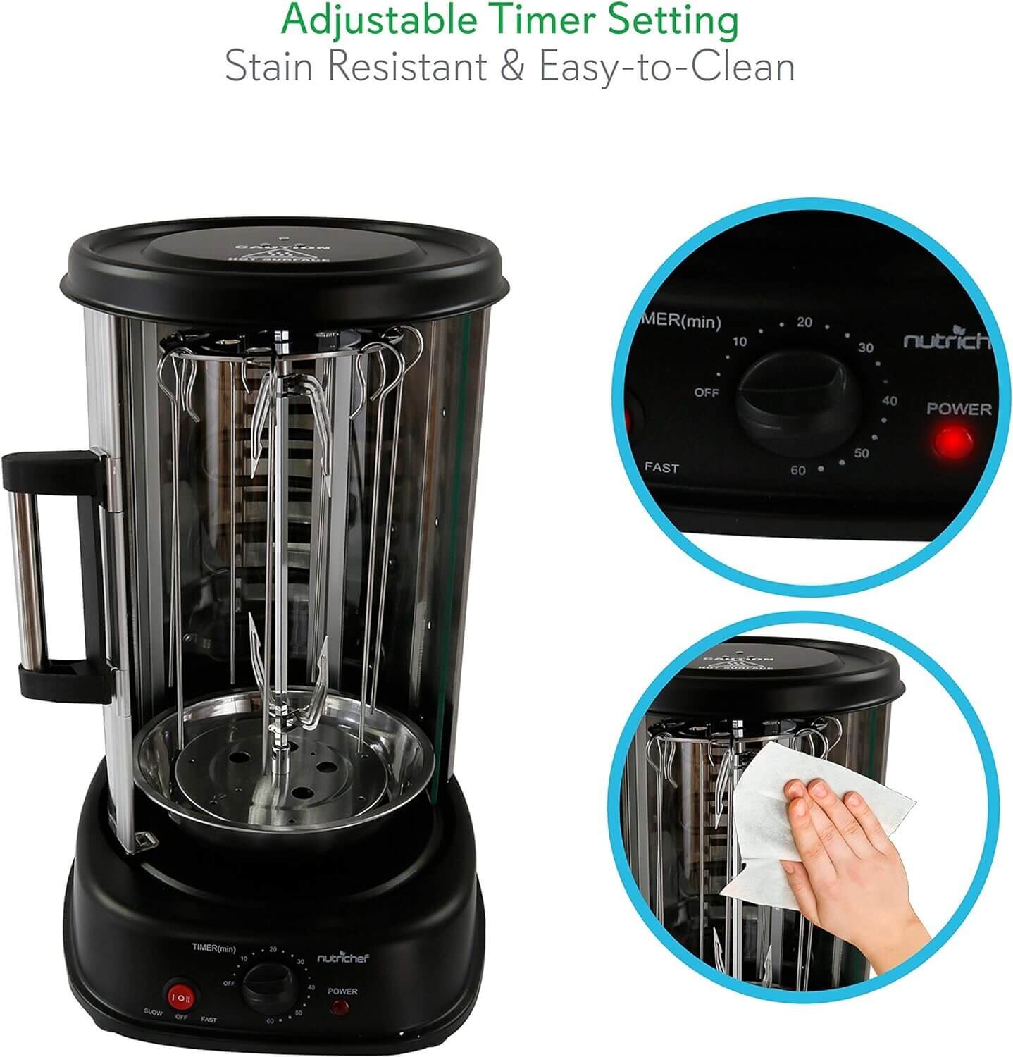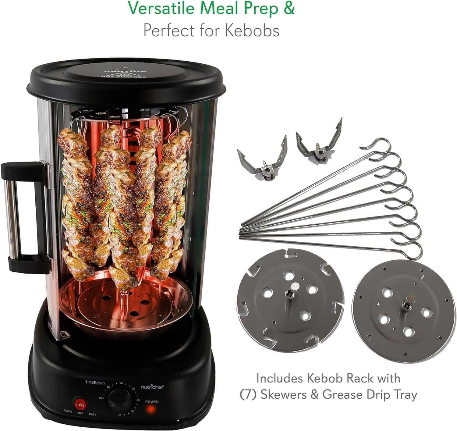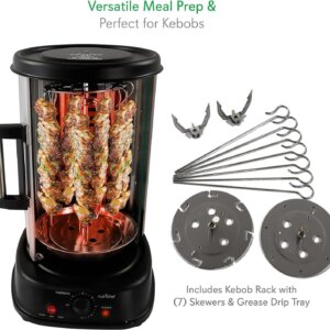 The rotisserie oven features stain-resistant housing for easy cleaning. Includes a kebob rack with seven skewers & grease drip tray for mess-free cooking